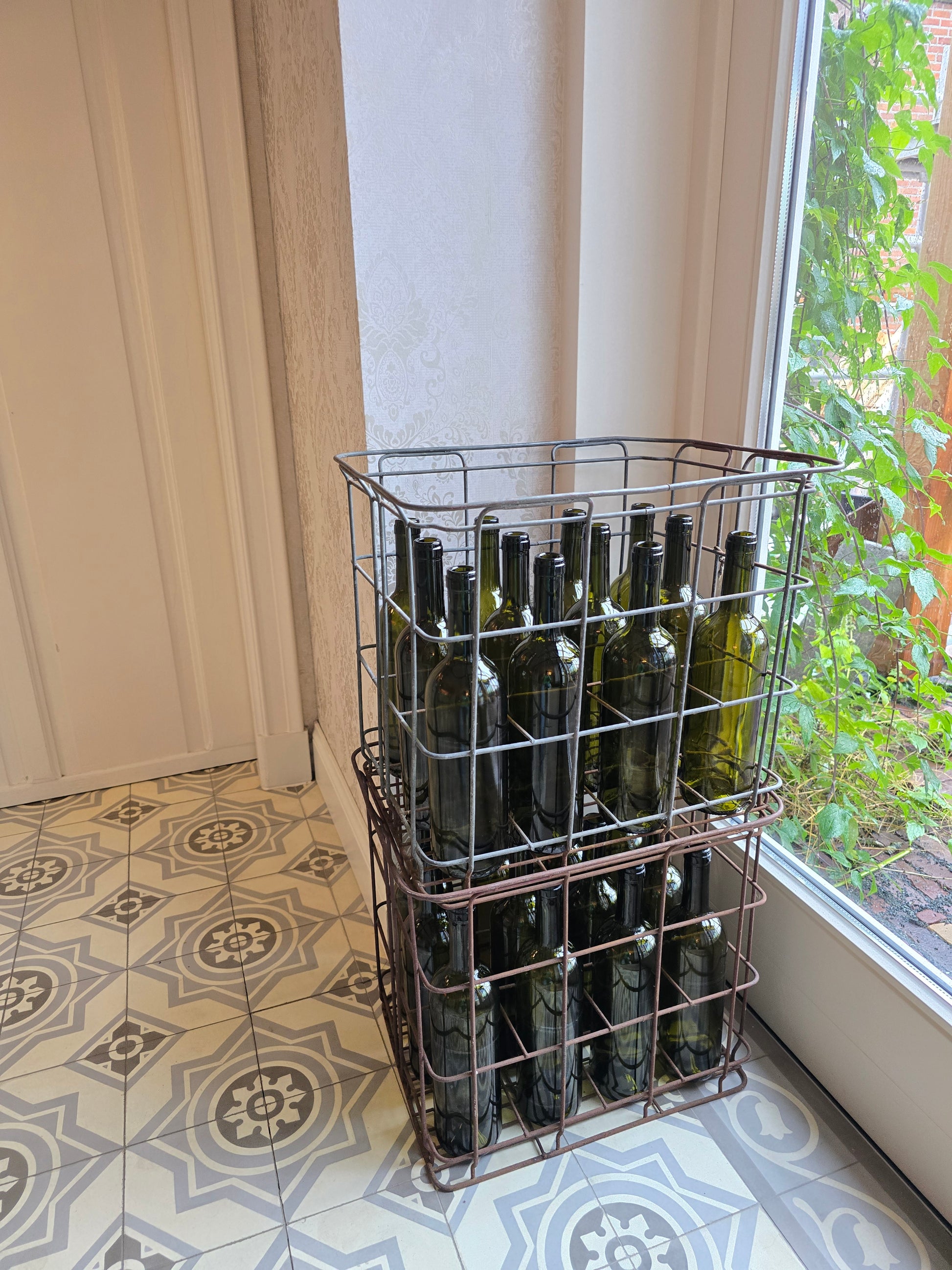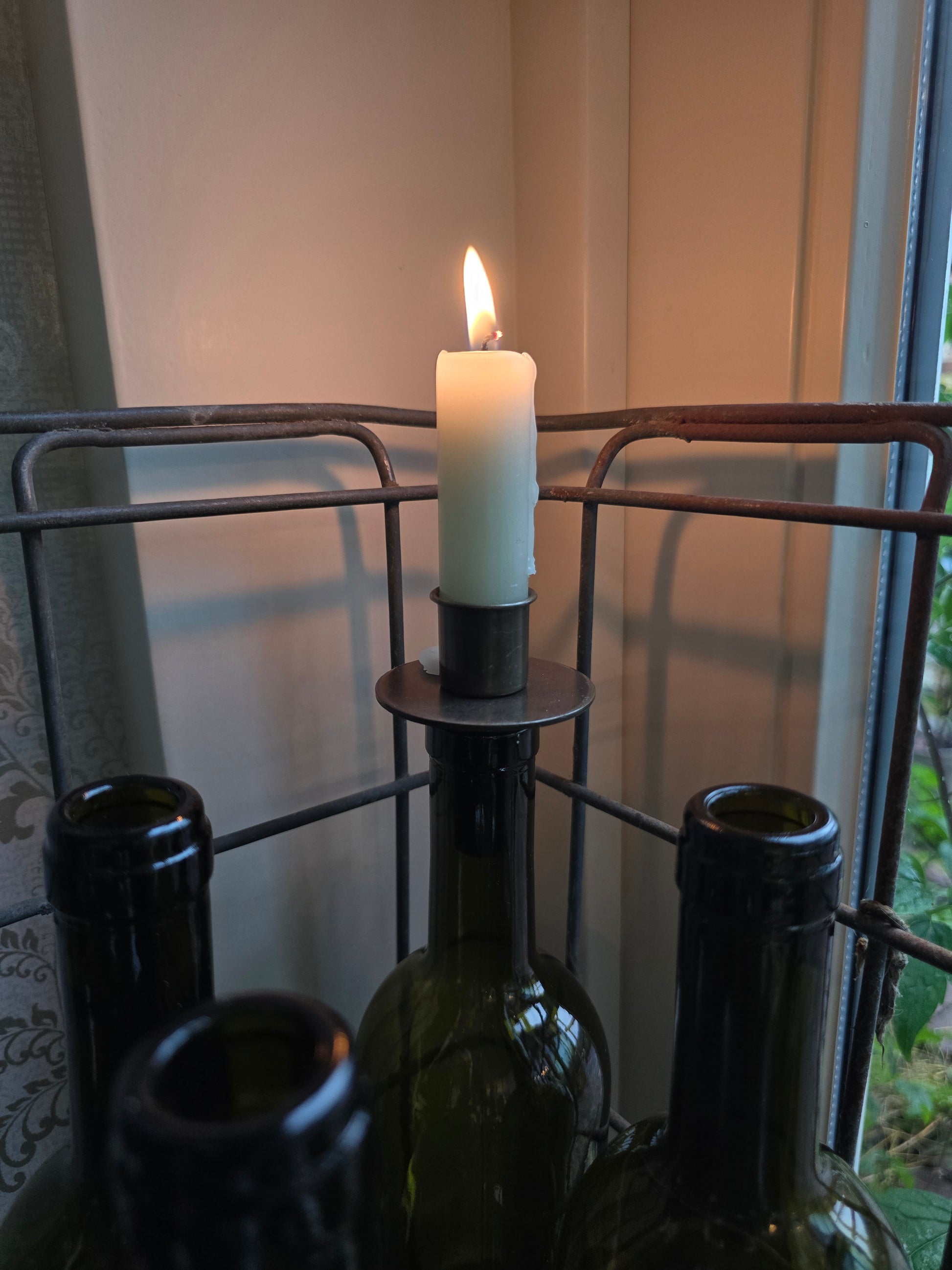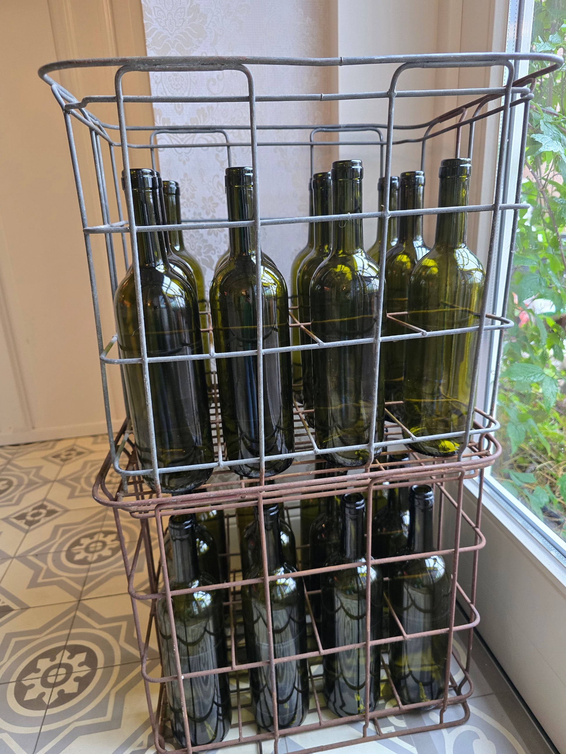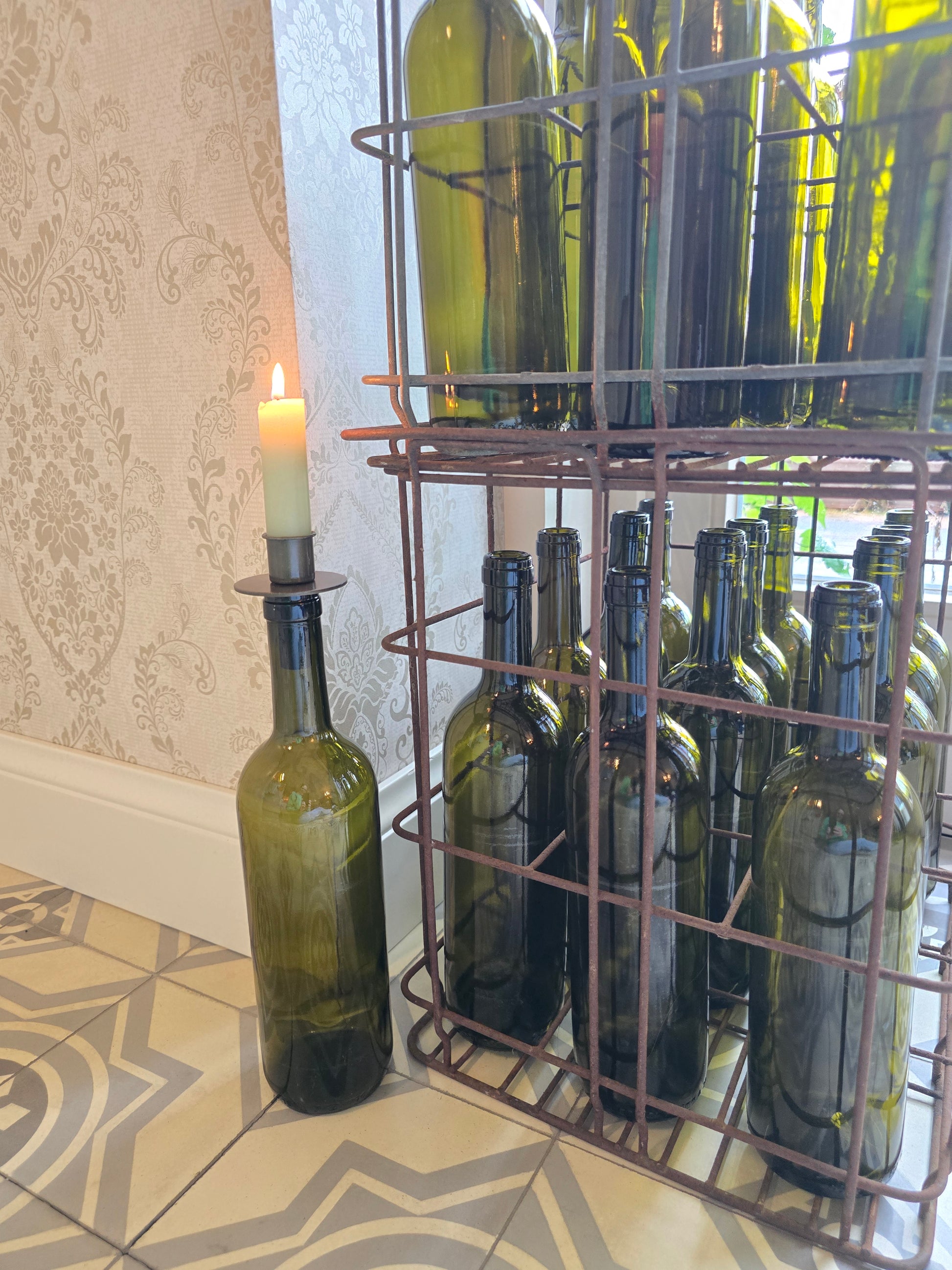 Breng sfeer in huis met deze oude metalen flessenbak inclusief 12 authentieke glazen flessen. Een uniek brocante item met prachtige patina, ideaal als decoratie of om kaarsen in de flessen te plaatsen voor extra warmte en charme.