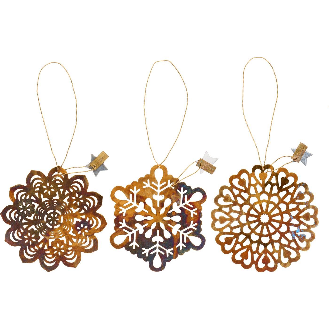Voeg een vleugje winterse elegantie toe aan je interieur met deze set van 3 messing sneeuwkristallen. De subtiele glans van het messing vangt prachtig het licht en brengt een sfeervolle, feestelijke uitstraling in elke ruimte.