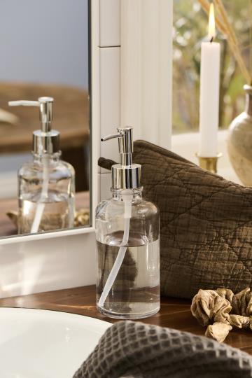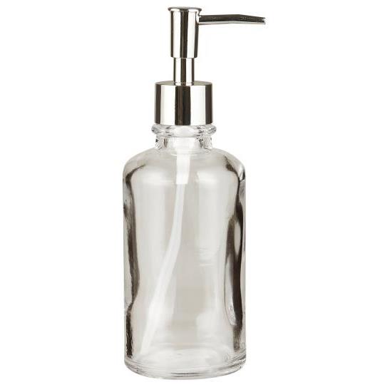 Zeepdispenser van helder glas met zilverkleurige pomp.