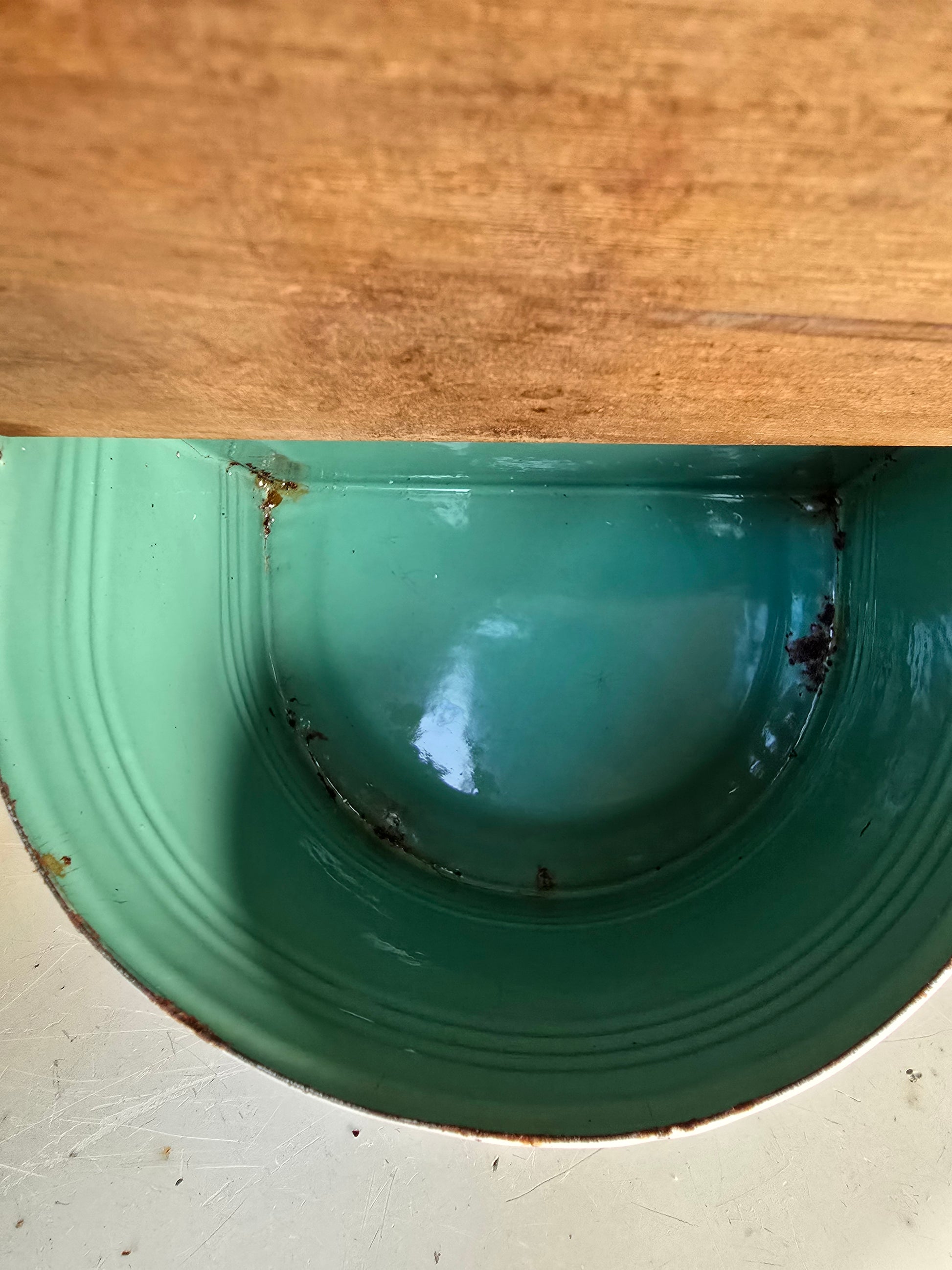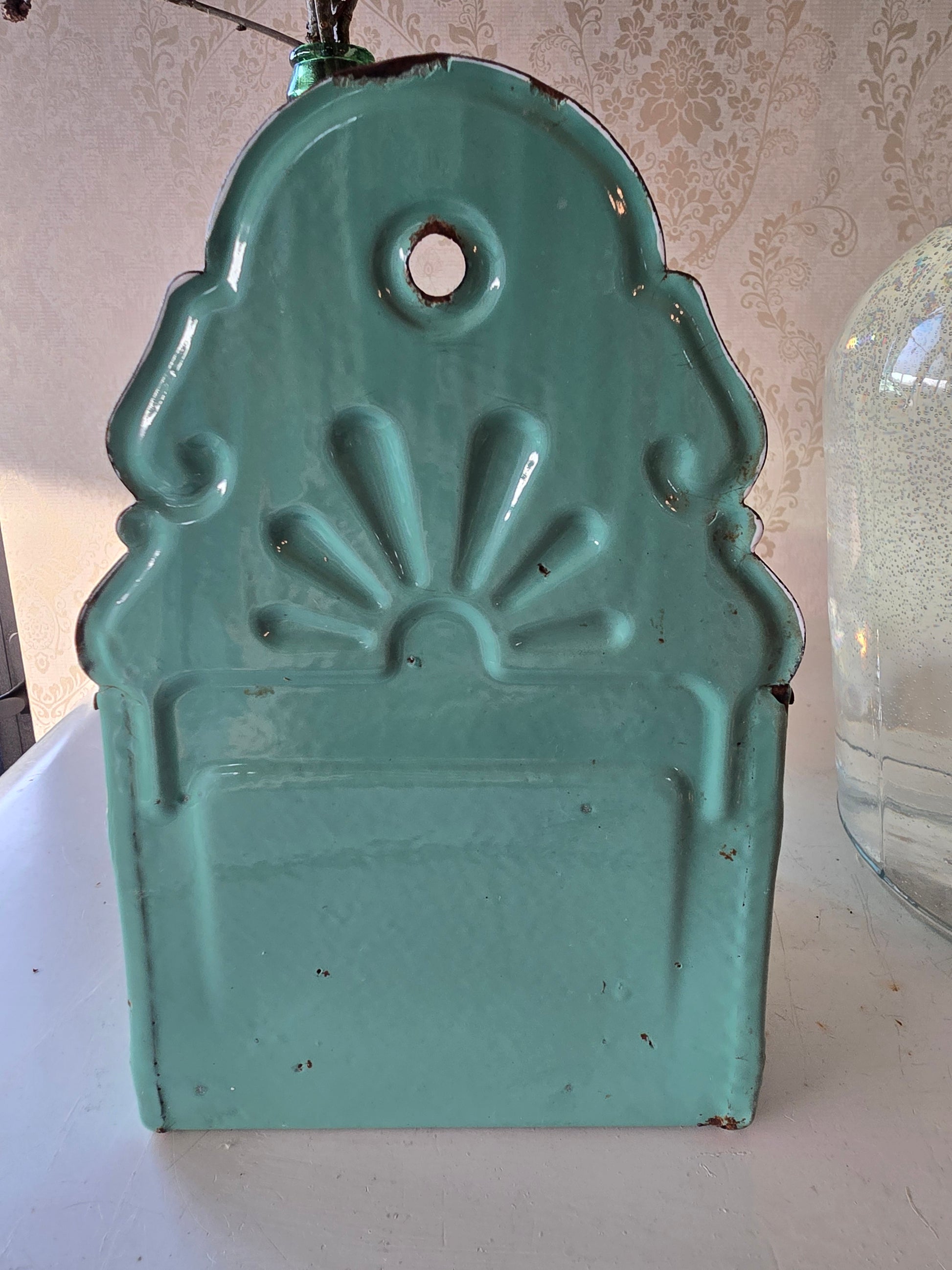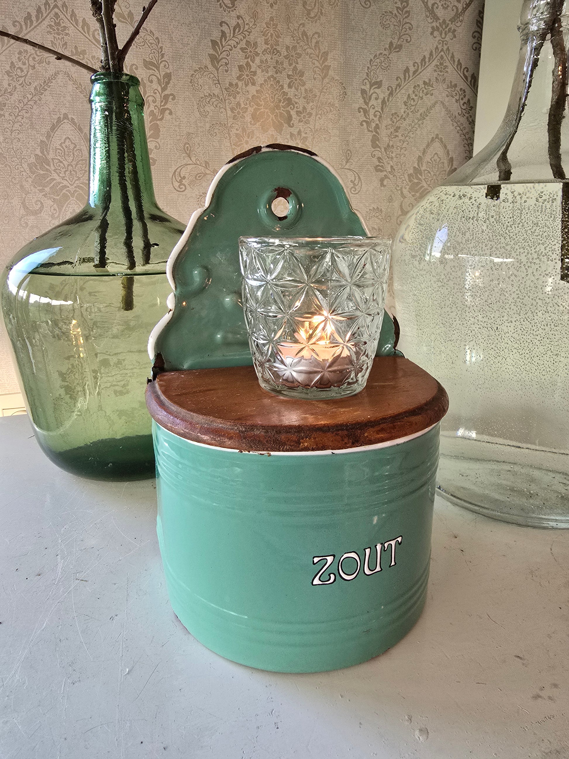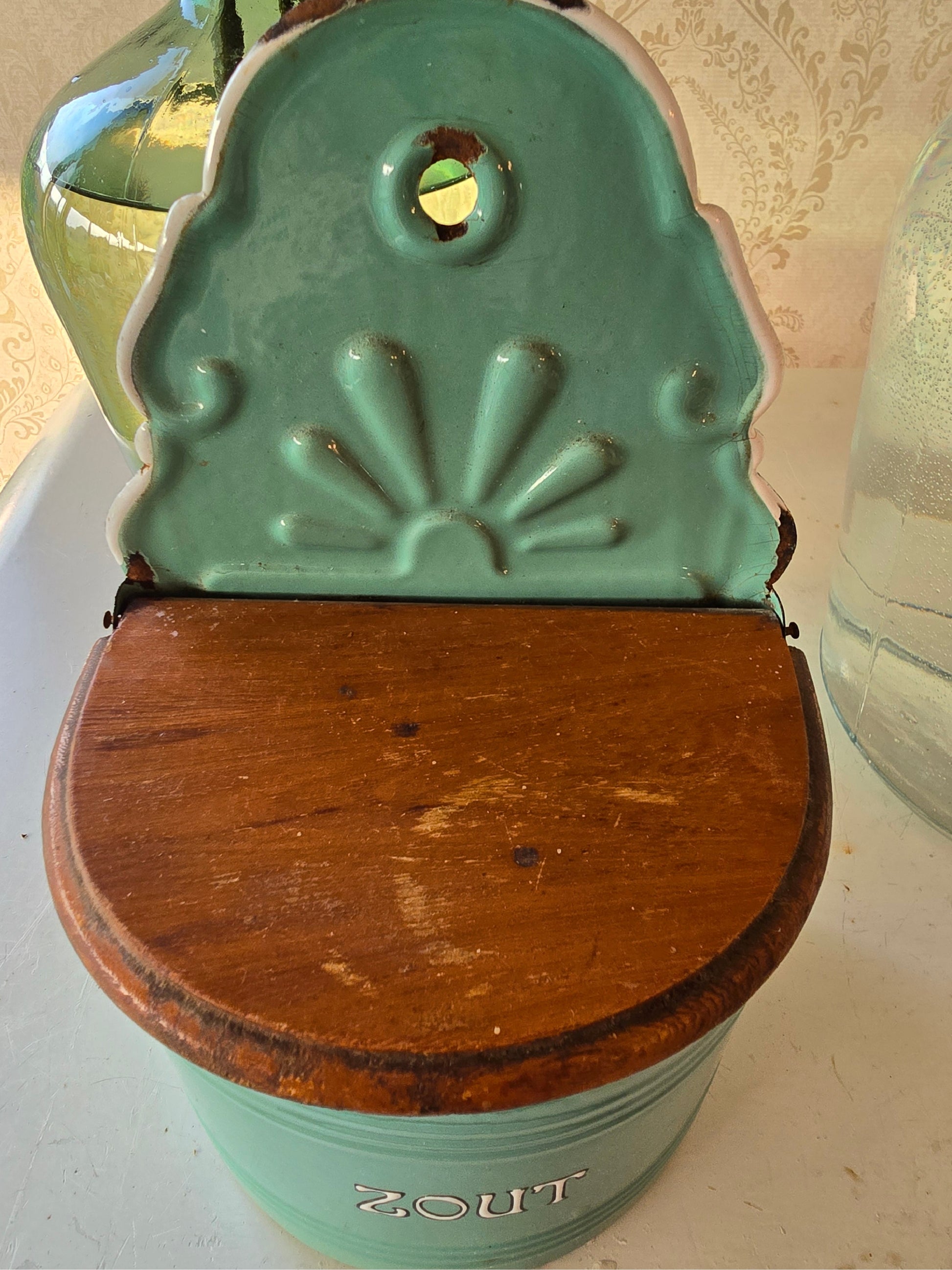 Charmant zoutpotje van emaille, met een mooie authentieke patina. Een sfeervol wandmodel dat perfect past in een landelijke of brocante keuken. Ideaal als decoratie of voor het opbergen van kleine keukenspulletjes. Uniek item dat karakter toevoegt aan elke ruimte.